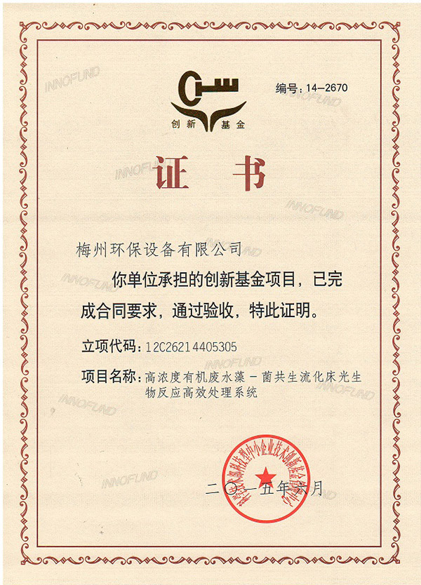 “高浓度有机废水藻-菌共生流化床光生物反应高效处理系统”创新基金立项验收合格证明